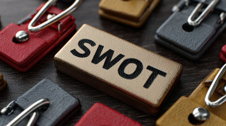 A creative arrangement of colorful clips surrounding a gold SWOT card, perfect for visualizing business strategies and enhancing planning sessions.