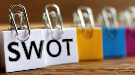 Colorful clips secure white cards with the term SWOT on a wooden surface, symbolizing the importance of evaluation in business strategy and planning processes.
