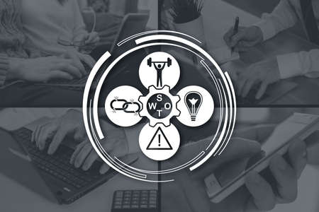 SWOT Analysis virtual diagram with Strengths, weaknesses, threats and opportunities of company.businessman typing keyboard with laptop computer and digital tablet on white desk in modern office