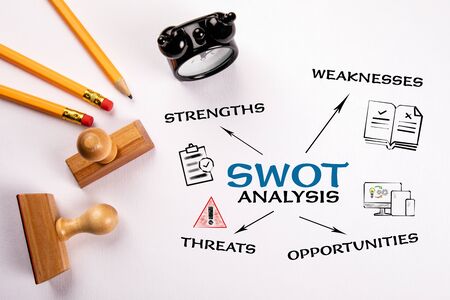 SWOT analysis. Strategy, planning, project and business concept. Chart with keywords and icons. Pencils, stamps and clock on a white table