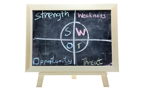 SWOT analysis, strength, weakness, opportunity, and threat words on blackboard.