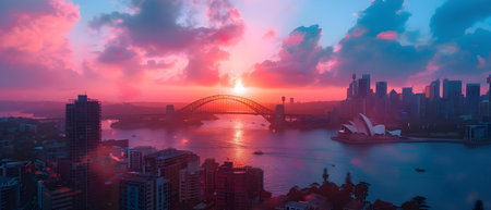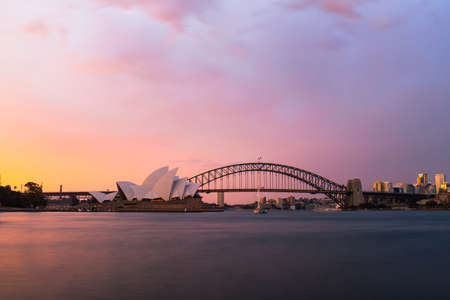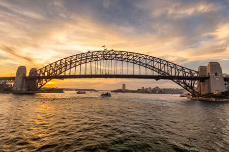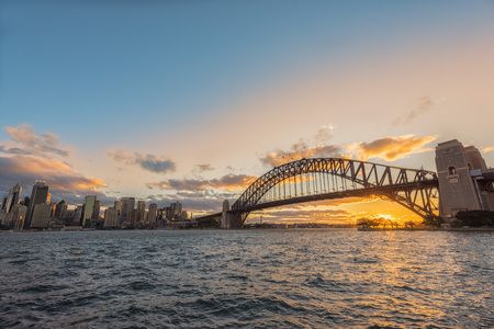 Famous sunset over Sydney Harbour Bridge. Stunning view of the waterfront near the Opera house