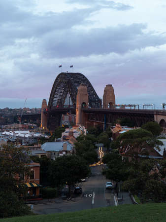 Sydney Harbour Bridge at blue hour against purple blue sky on the background. Sydney, Australia