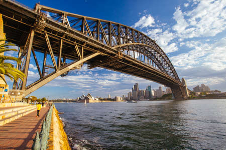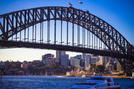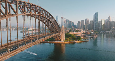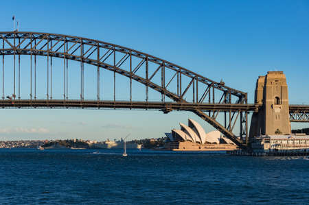 Sydney, Australia - August 14, 2022: Warm sunlight on Sydney Harbour Bridge in the morning.
