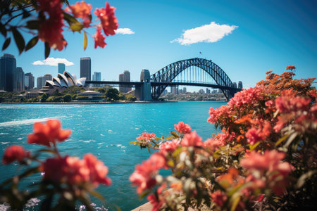 Sydney, Australia - June 30, 2018: Wide view of Sydney Harbour Bridge and Opera House in the morning with clear sky.