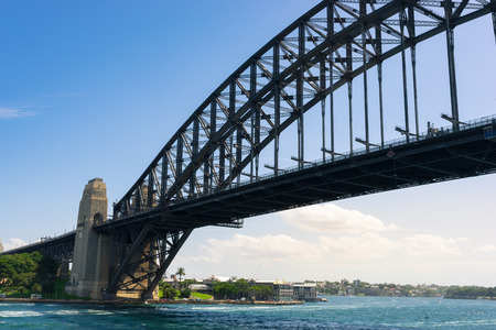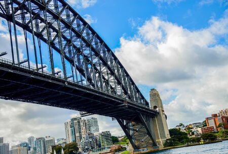 Low angle view of Sydney Harbour Bridge in Australia with view of harbour and downtown skyline.