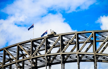 Sydney Harbour Bridge Sydney Harbour area Australia 12.12.2013 . National flags flying. Low angle looking up through bridge to blue sky with cloudsHigh quality photo