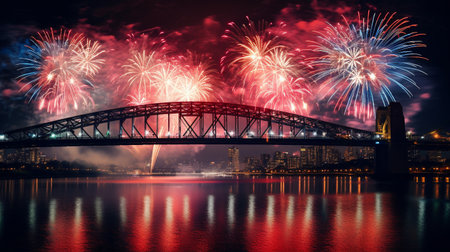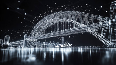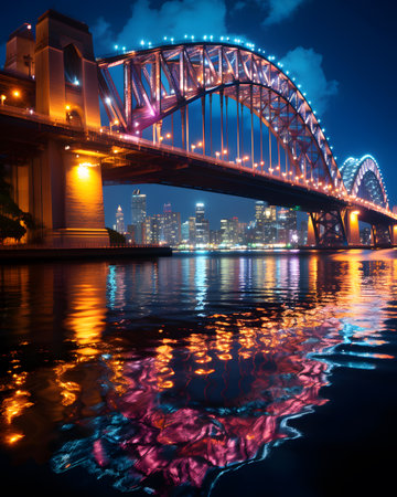 An empty sydney harbour bridge and city setting at night. Bright empty city lights shine.vibrant cityscape