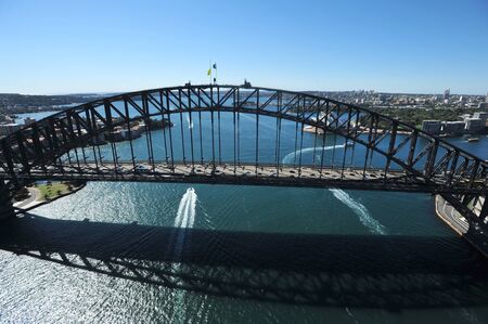 Close up view Sydney Harbor Bridge arch over Sydney Harbor, connecting north shore to bustling central business district, small boat navigating the waters. Architecture and transport. Aerial panorama