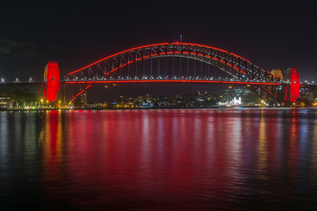 28 January 2017 - Sydney harbour bridge painted red for Chinese / Lunar New Year celebrations reflecting in the water