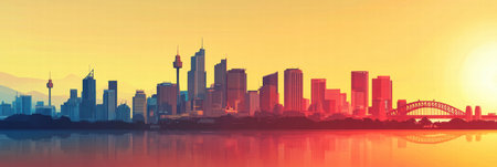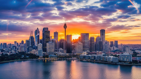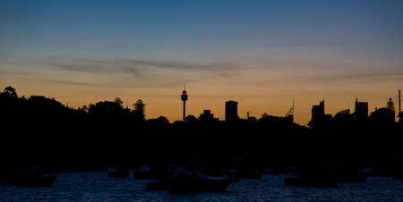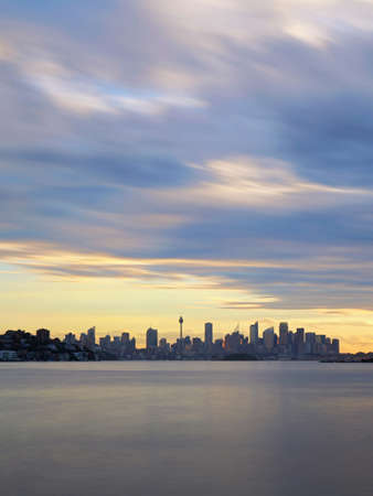 Sydney city skyline at sunrise/sunset in New South Wales, Australia.