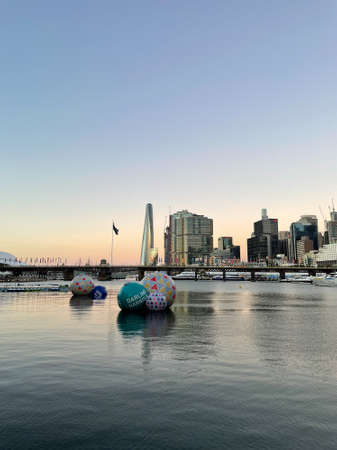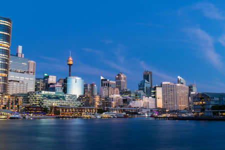 Modern cityscape with business office buildings and picturesque harbour at sunset. Darling Harbour, Sydney, Australia