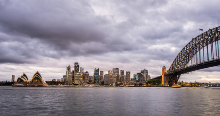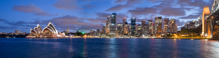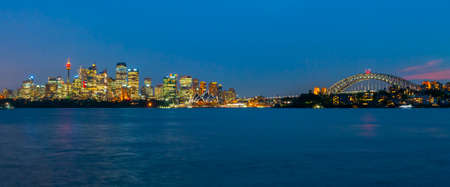 Panoramic photo of Sydney skyline with Harbour Bridge in the evening after sunset