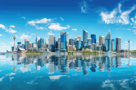 Toronto city skyline with reflection in water, Ontario, Canada, Europe, Sydney City panoramic view. Australia, July. Skyscrapers reflected in the water, AI Generated