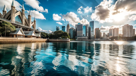 Modern cityscape skyline reflected in calm blue water with a bridge and sunshine over cloudy sky.
