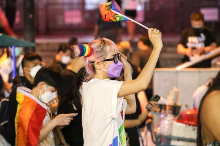 Celebrate in pride month festival. Pride movement transgender asian couple lesbian LGBT holding rainbow flag for freedom. Gatherings of friends in parade communities celebrating LGBTQ+ causes.