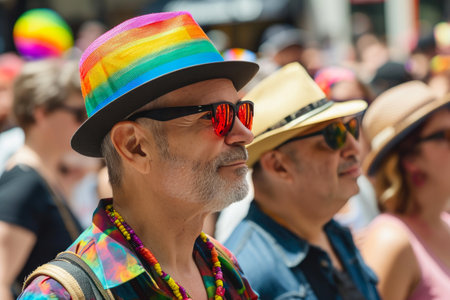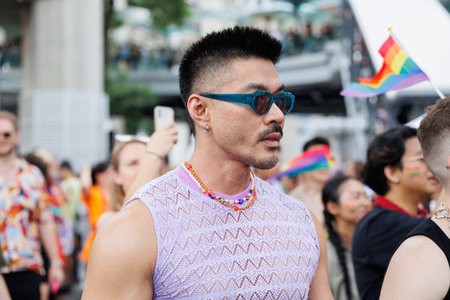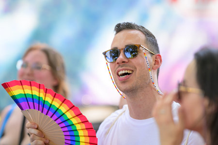Vienna, Austria - June 08, 2024: People at Vienna Pride in summer on Wiener Ringstrasse, portrait of a man with sunglasses