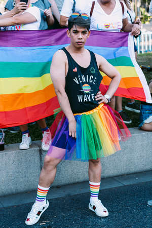 PATTAYA, THAILAND - FEBRUARY 15, 2020: a part of colorful of LGBT parade with people wearing rainbow color take part in Pattaya International Pride 2020 in Pattaya, Thailand on February 15, 2020