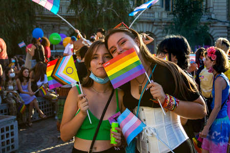 Tel Aviv Yafo, Israel - June 10, 2022. Young girls in clothes of the lgbt rainbow colors on the Gay Pride Parade