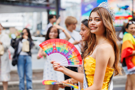 Asian lady wearing rainbow flag wristbands, symbol of LGBT pride month celebrate annual in June social of gay, lesbian, bisexual, transgender, human rights.