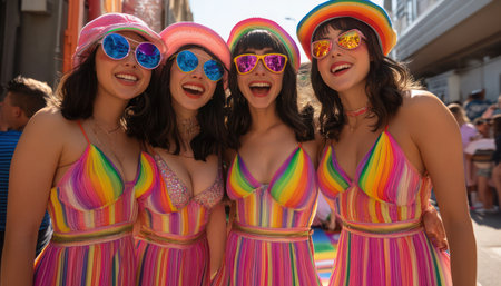 Four friends radiate joy at the Pride parade, dazzling in vibrant, matching rainbow outfits and accessories Their coordinated style and shared smiles capture the essence of the celebration This group photo embodies the spirit of unity and pride, a testament to their strong bond and commitment to equality AI Generative