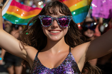 woman smiling at a pride parade wearing colorful sunglasses and a rainbow scarf
