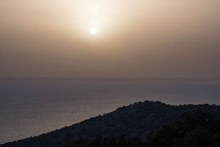 Sea sunset. Dark silhouette of the coast. Sunset haze.