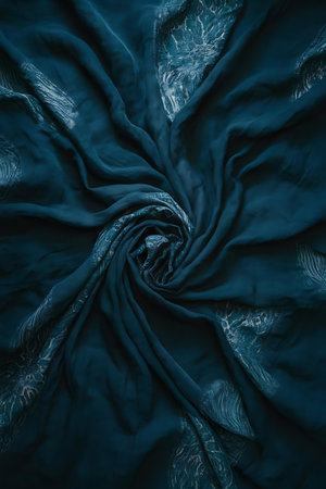 A stunning blue silk scarf elegantly arranged on a mannequin, highlighting intricate patterns and textures against a soft light backdrop.