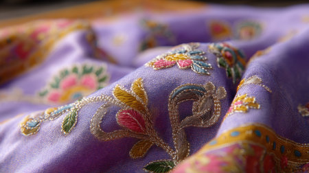 Captivating close-up showcasing exquisite embroidery on a soft purple fabric, highlighting vibrant colors and intricate floral designs.