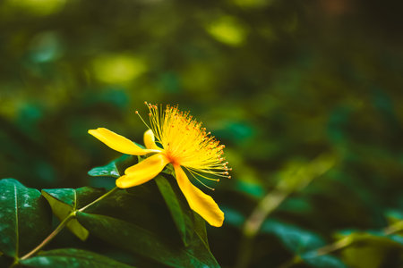 St. John's Wort yellow five petal flower bud with pistils and stamens on a green natural background. Medicinal plant in full bloom in summer garden.