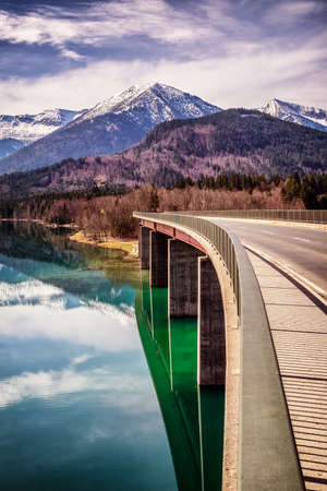 View to lake with bridge Sylvenstein Karwendel mountains at springtime