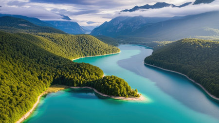 Aerial view of a beautiful mountain lake surrounded by forest and mountains.