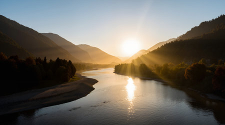 Panoramic view of the river and the mountains at sunset.