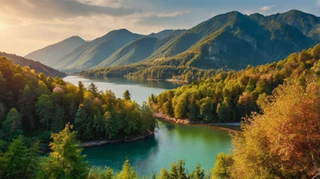 panoramic view of mountain lake and forest at sunset in autumn