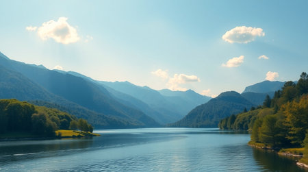 A serene lake surrounded by mountains and lush forests, reflecting the sky and trees.