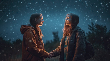 An AI-generated illustration of Two teenage friends standing in a forest to enjoy their friendship in a carefree moment