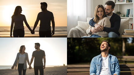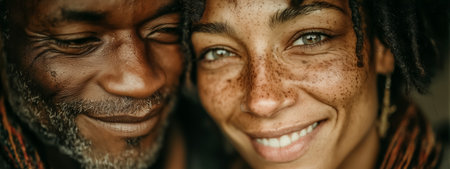A joyful couple smiling closely together, showing love and warmth in their expressions