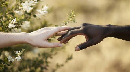 Touching Hands of Different Skin Tones with Blossoming Bush in Background. High quality photo
