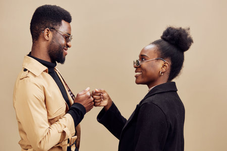 Happy couple sharing a playful moment, dressed in stylish casual outfits with sunglasses, against a neutral beige background in a warm color palette