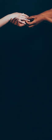 Romance, relations. Racial tolerance. Respect social unity. African and caucasian hands gesturing on gray studio background. Human rights, friendship, intenational unity concept. Interracial unity.