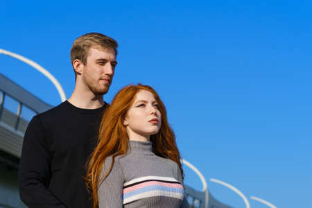 happy young couple man and woman with long red hair, stand against the background of a blue sky and a bridge in casual clothes and smile. Cheerful guy and Caucasian girl on a sunny day