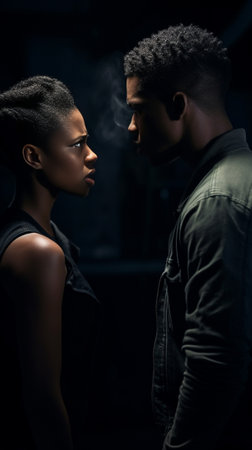 Young black indignant male gesticulating arguing with his dark skinned girlfriend who is standing against wooden wall with crossed arms looking away with deeply offended : Generative AI