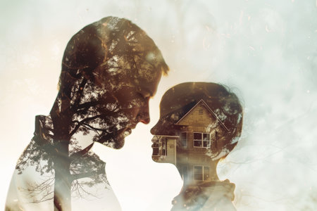 Man and woman profile multiple exposure portrait. Codependency and relationship.