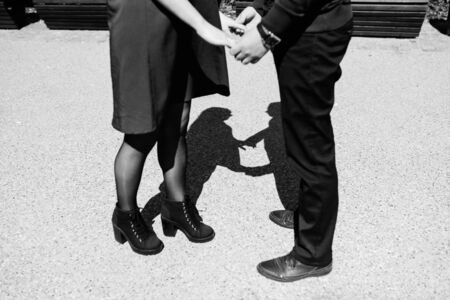 Valentine's Day, a holiday for lovers, a romantic date, a red heart, February 14 A loving couple holding hands, shadows of people, silhouettes of a young couple. High quality