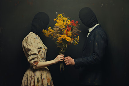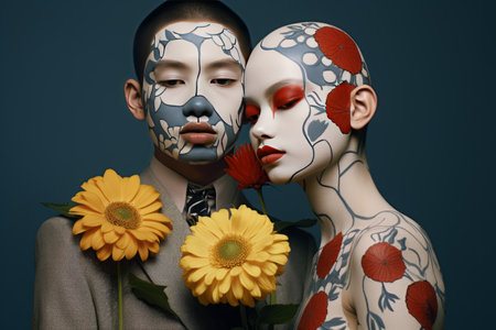 A man and woman are seen with vibrant flowers intricately placed in their hair, creating a striking visual effect. The flowers add a touch of nature and color to their appearance.
