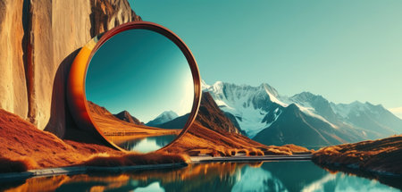 A close-up of a mirror reflecting a scenic mountain landscape, combining nature with reflection.