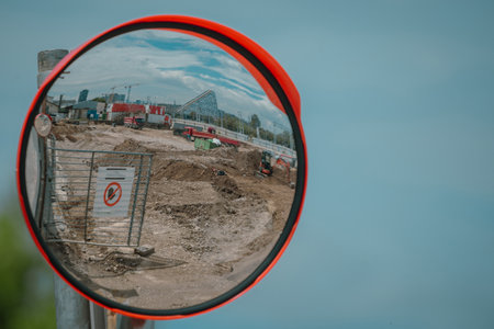 Round traffic mirror mounted high to help drivers view around the blind corner. This mirror is on the construction site exit