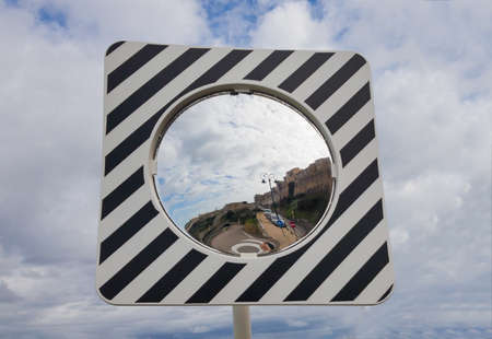 Round road mirror against the cloudy sky.