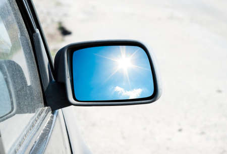car rear-view mirror with a reflection of the sun