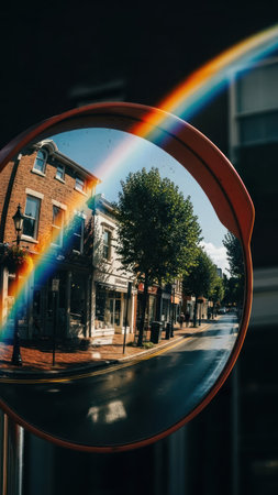 Reflection of a rainbow in a round mirror on a city street